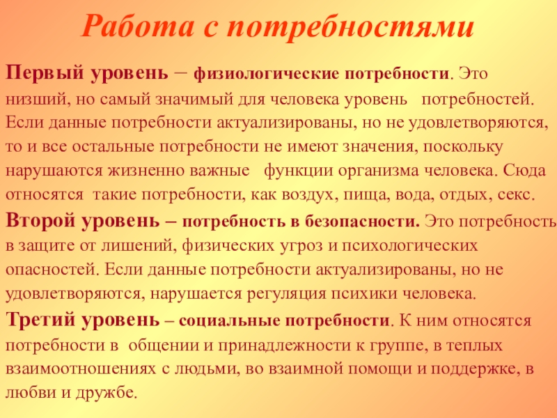 относятся такие потребности, как воздух, пища, вода, отдых, секс.