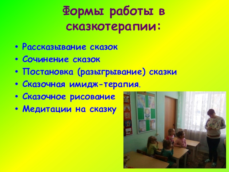 Формы работы в сказкотерапии:   Рассказывание сказокСочинение сказокПостановка (разыгрывание) сказкиСказочная имидж-терапия.Сказочное рисованиеМедитации на сказку