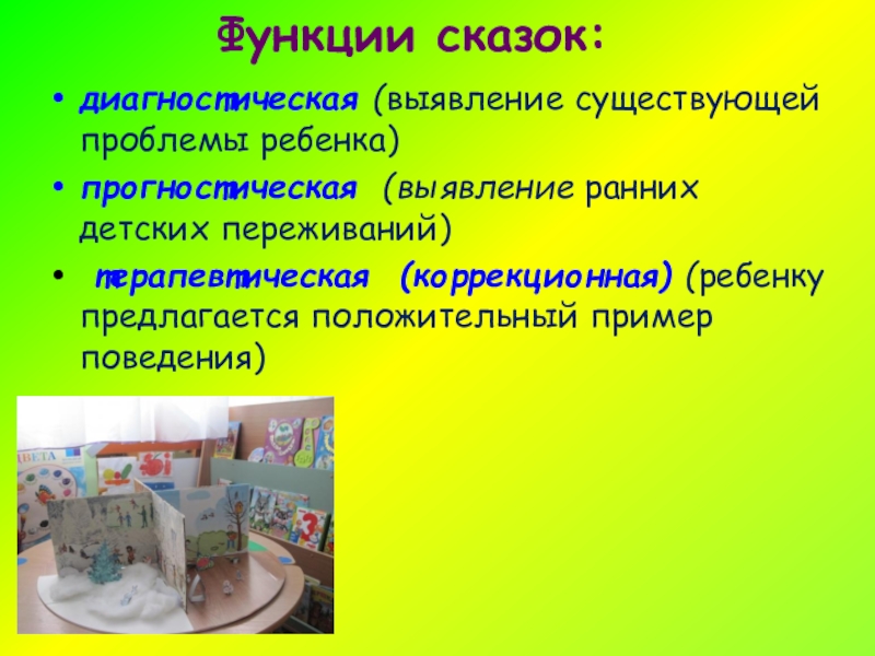 Функции сказок: диагностическая (выявление существующей проблемы ребенка)прогностическая  (выявление ранних детских переживаний)  терапевтическая  (коррекционная) (ребенку предлагается положительный пример поведения)