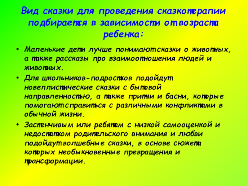 Слайд 7Вид сказки для проведения сказкотерапии подбирается в зависимости от возраста ребенка: