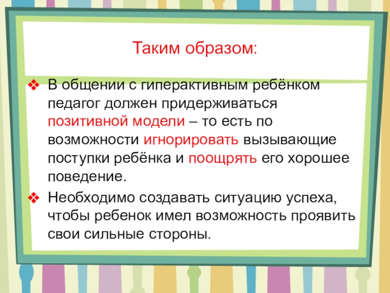 В общении с гиперактивным ребёнком педагог должен придерживаться позитивной модели