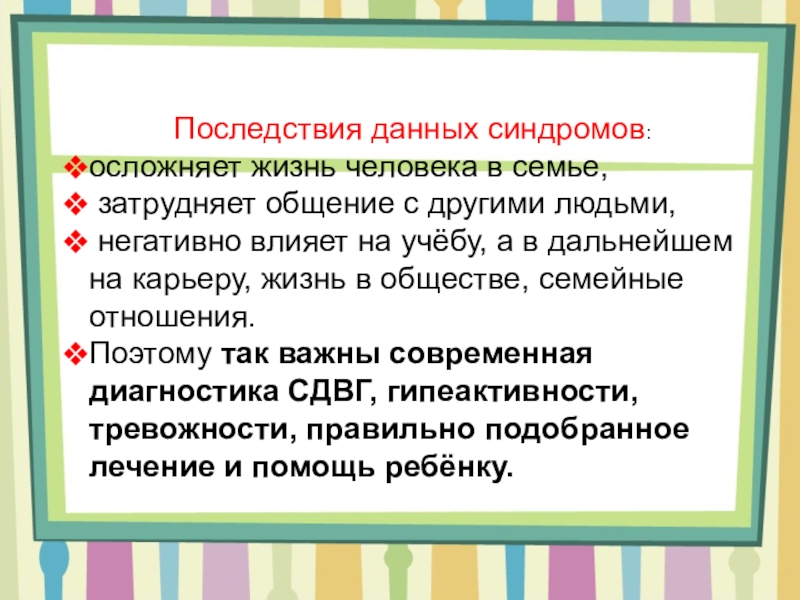 Поэтому так важны современная диагностика СДВГ, гипеактивности, тревожности, правильно подобранное лечение и помощь ребёнку.