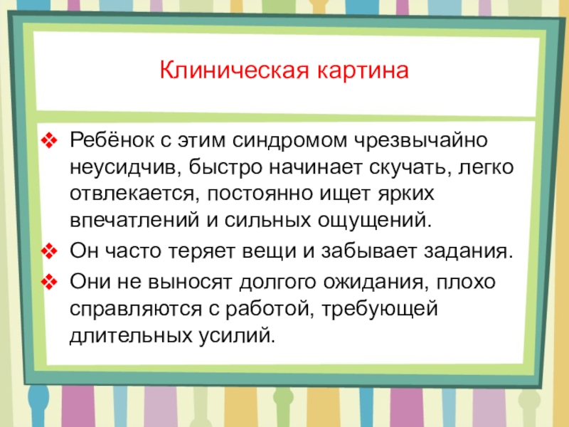 Ребёнок с этим синдромом чрезвычайно неусидчив, быстро начинает скучать, легко