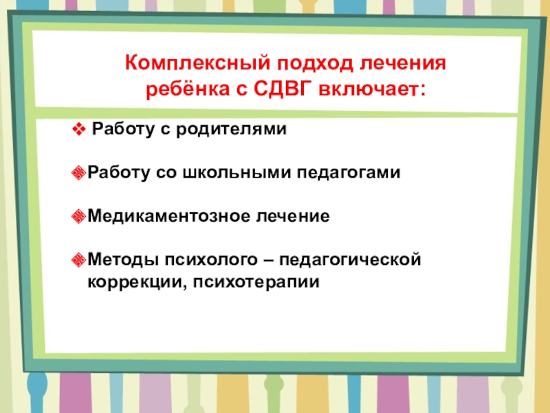 Комплексный подход лечения ребёнка с СДВГ включает: