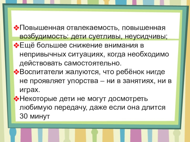 Повышенная отвлекаемость, повышенная возбудимость: дети суетливы, неусидчивы;