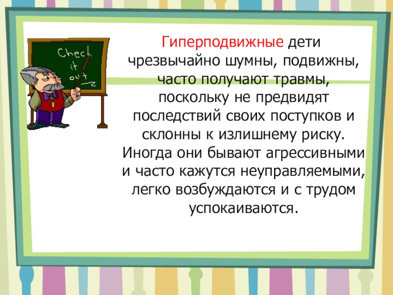 Слайд 5 Гиперподвижные дети чрезвычайно шумны, подвижны, часто получают травмы, поскольку не