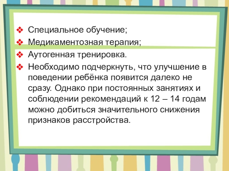поведении ребёнка появится далеко не сразу. Однако при постоянных занятиях и соблюдении рекомендаций к 12 – 14 годам можно добиться значительного снижения признаков расстройства.