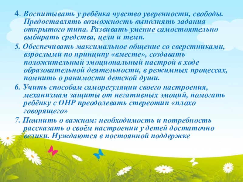 Предъявлять к ребёнку требования соответственно его уровню, не предъявлять сверх требований. Воспитывать и закреплять чувства успеха и успешности.