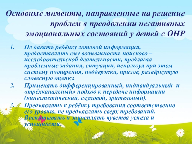 Применять дифференцированный, индивидуальный и «трёхканальный» подход к передаче информации (кинестетический, слуховой, зрительный).