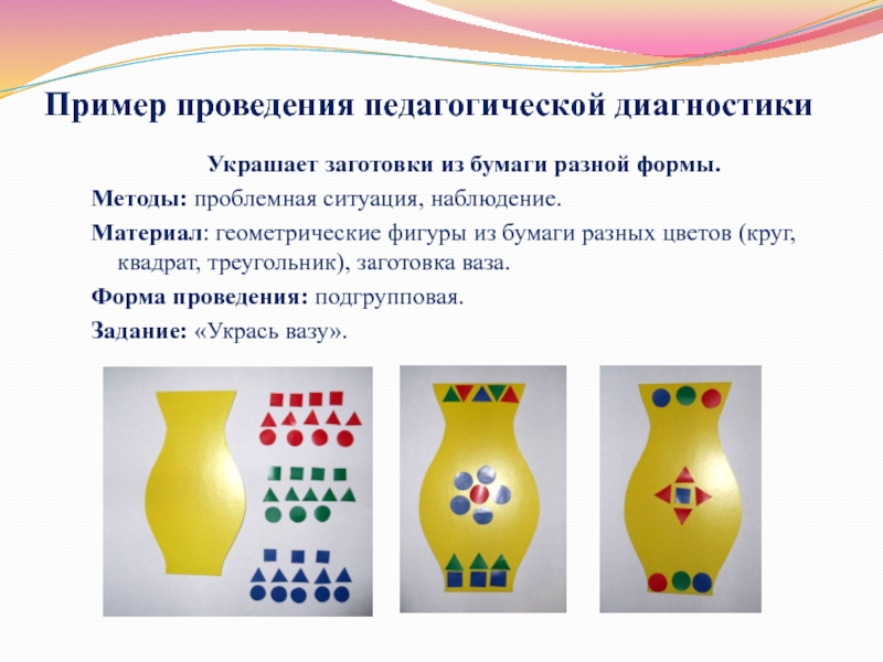 Материал: геометрические фигуры из бумаги разных цветов (круг, квадрат, треугольник), заготовка ваза.