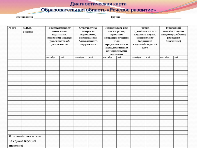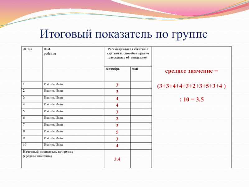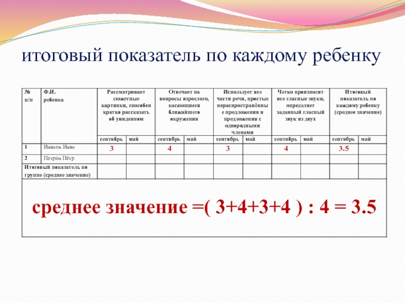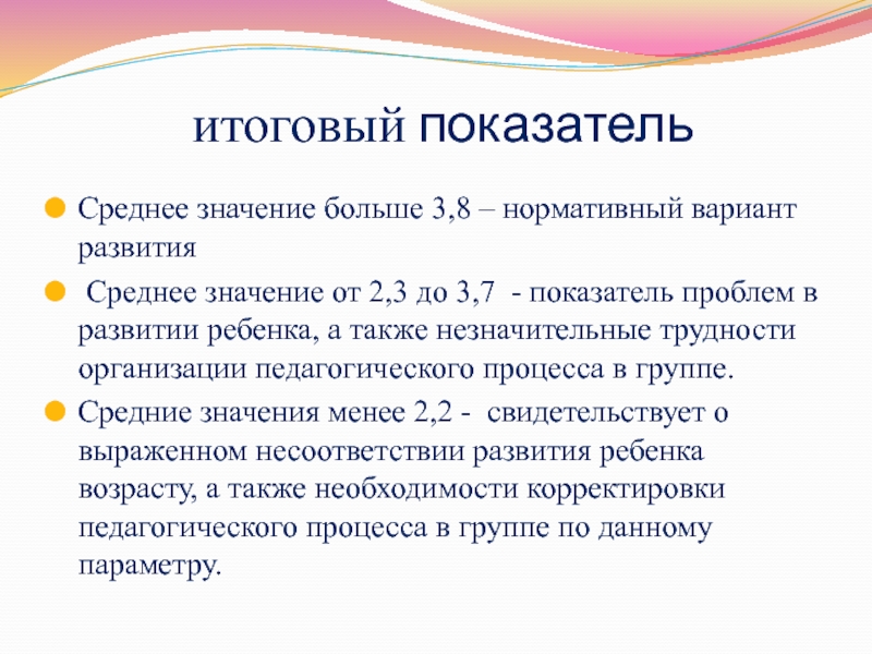 Средние значения менее 2,2 - свидетельствует о выраженном несоответствии развития ребенка возрасту, а также необходимости корректировки педагогического процесса в группе по данному параметру.