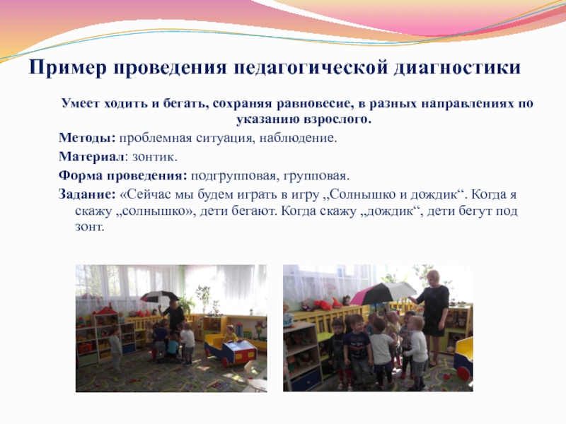 Задание: «Сейчас мы будем играть в игру „Солнышко и дождик“. Когда я скажу „солнышко», дети бегают. Когда скажу „дождик“, дети бегут под зонт.