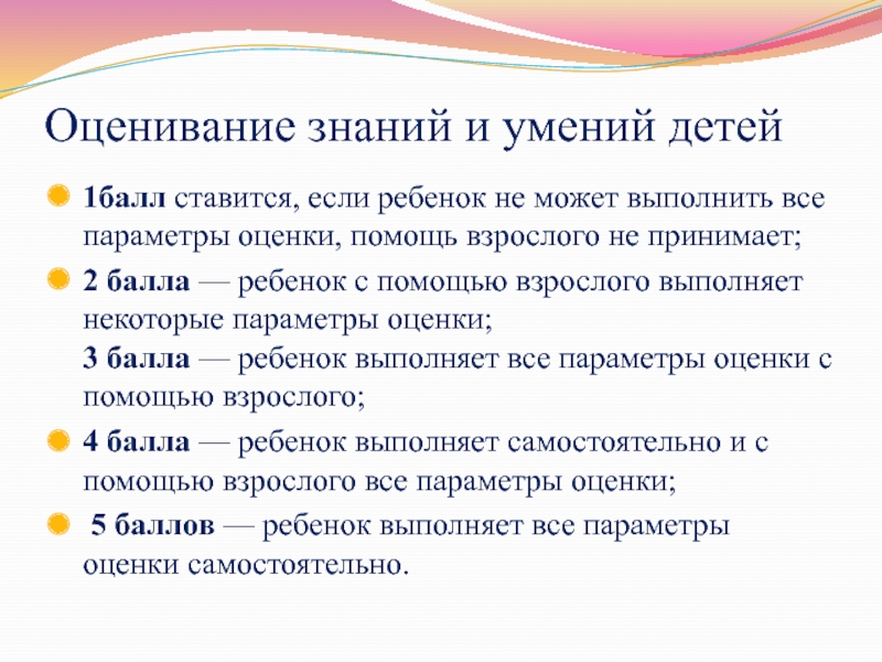 5 баллов — ребенок выполняет все параметры оценки самостоятельно.