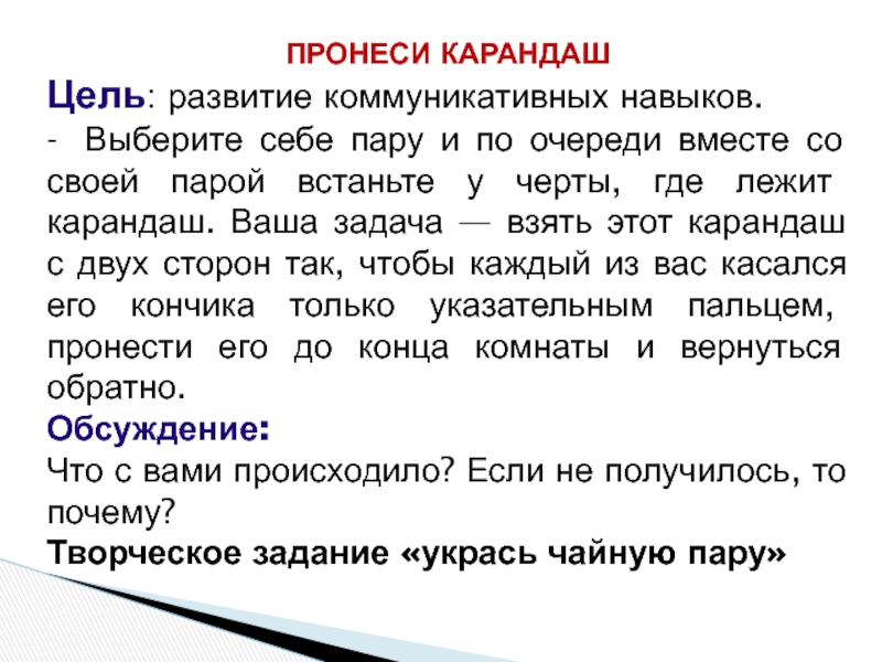 вместе со своей парой встаньте у черты, где лежит карандаш. Ваша задача — взять этот карандаш с двух сторон так, чтобы каждый из вас касался его кончика только указательным пальцем, пронести его до конца комнаты и вернуться обратно.