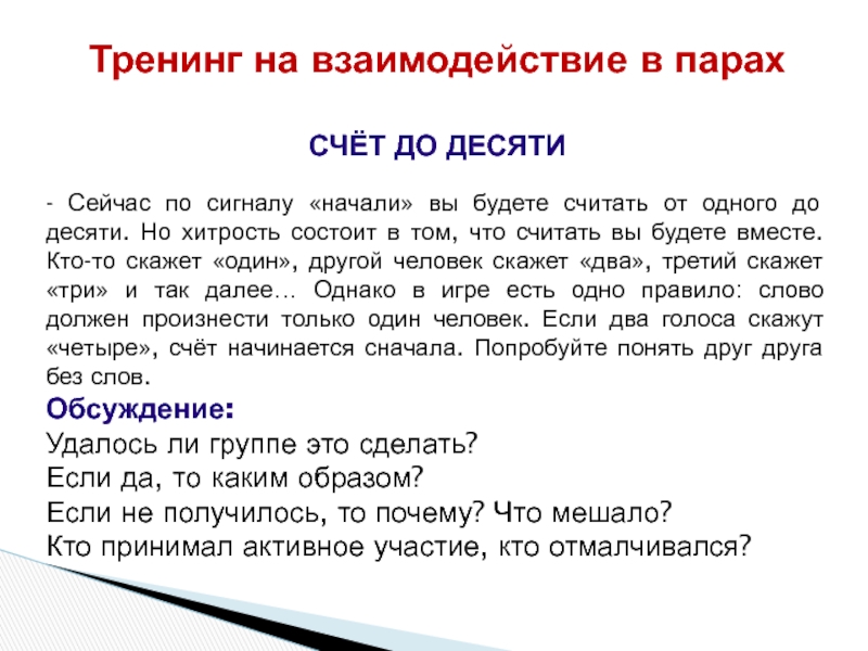 вы будете считать от одного до десяти. Но хитрость состоит в том, что считать вы будете вместе. Кто-то скажет «один», другой человек скажет «два», третий скажет «три» и так далее… Однако в игре есть одно правило: слово должен произнести только один человек. Если два голоса скажут «четыре», счёт начинается сначала. Попробуйте понять друг друга без слов.