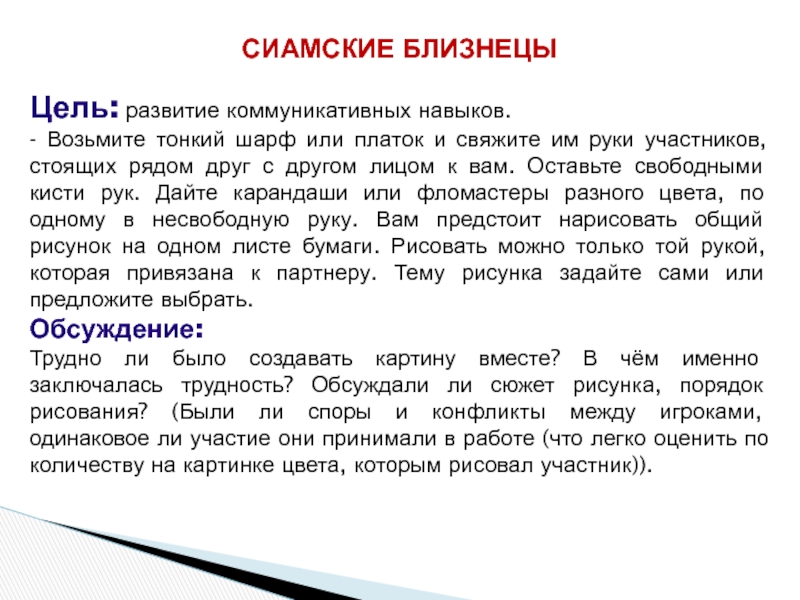 свяжите им руки участников, стоящих рядом друг с другом лицом к вам. Оставьте свободными кисти рук. Дайте карандаши или фломастеры разного цвета, по одному в несвободную руку. Вам предстоит нарисовать общий рисунок на одном листе бумаги. Рисовать можно только той рукой, которая привязана к партнеру. Тему рисунка задайте сами или предложите выбрать.