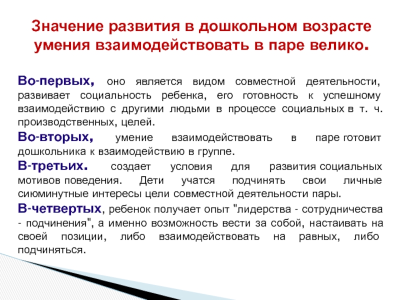 Слайд 5Значение развития в дошкольном возрасте умения взаимодействовать в паре велико.