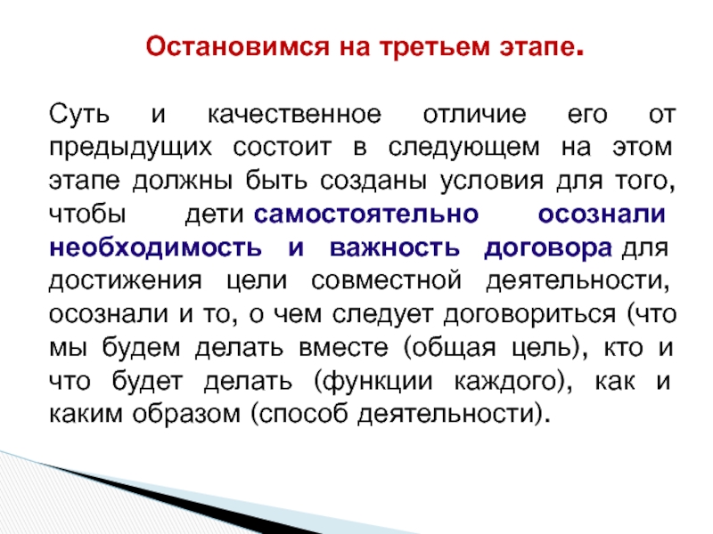состоит в следующем на этом этапе должны быть созданы условия для того, чтобы дети самостоятельно осознали необходимость и важность договора для достижения цели совместной деятельности, осознали и то, о чем следует договориться (что мы будем делать вместе (общая цель), кто и что будет делать (функции каждого), как и каким образом (способ деятельности).