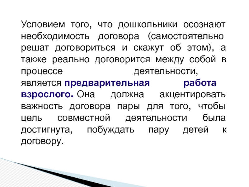 Слайд 9Условием того, что дошкольники осознают необходимость договора (самостоятельно решат договориться и