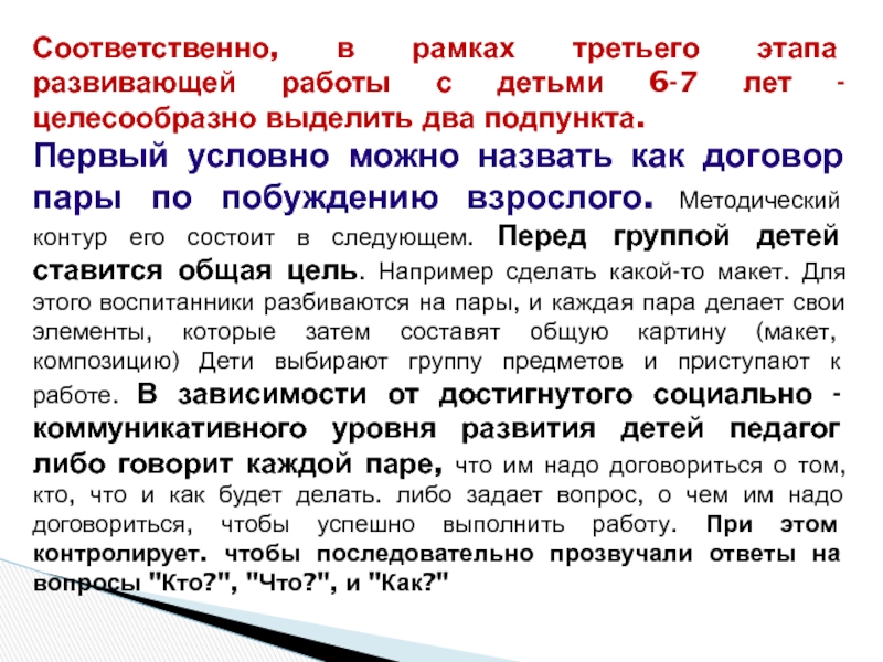 Первый условно можно назвать как договор пары по побуждению взрослого. Методический контур его состоит в следующем. Перед группой детей ставится общая цель. Например сделать какой-то макет. Для этого воспитанники разбиваются на пары, и каждая пара делает свои элементы, которые затем составят общую картину (макет, композицию) Дети выбирают группу предметов и приступают к работе. В зависимости от достигнутого социально - коммуникативного уровня развития детей педагог либо говорит каждой паре, что им надо договориться о том, кто, что и как будет делать. либо задает вопрос, о чем им надо договориться, чтобы успешно выполнить работу. При этом контролирует. чтобы последовательно прозвучали ответы на вопросы "Кто?", "Что?", и "Как?"