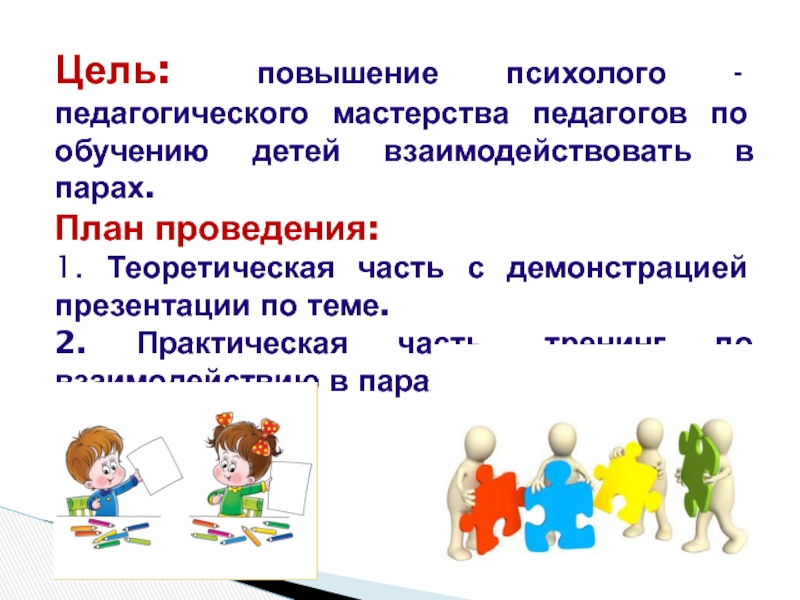 Слайд 3Цель: повышение психолого - педагогического мастерства педагогов по обучению детей взаимодействовать