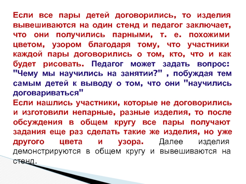 и педагог заключает, что они получились парными, т. е. похожими цветом, узором благодаря тому, что участники каждой пары договорились о том, кто, что и как будет рисовать. Педагог может задать вопрос: "Чему мы научились на занятии?" , побуждая тем самым детей к выводу о том, что они "научились договариваться"