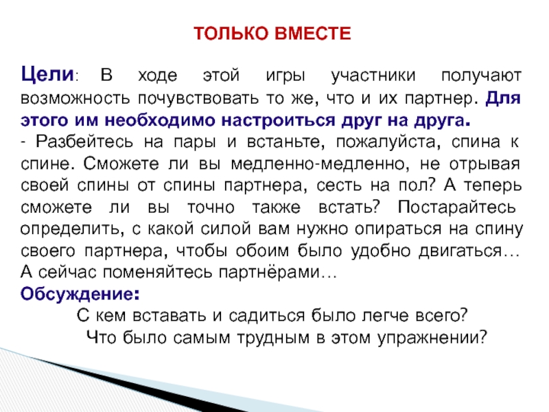 - Разбейтесь на пары и встаньте, пожалуйста, спина к спине. Сможете ли вы медленно-медленно, не отрывая своей спины от спины партнера, сесть на пол? А теперь сможете ли вы точно также встать? Постарайтесь определить, с какой силой вам нужно опираться на спину своего партнера, чтобы обоим было удобно двигаться… А сейчас поменяйтесь партнёрами…