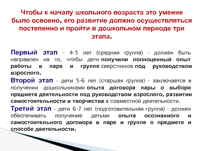Первый этап - 4-5 лет (средняя группа) - должен быть направлен на то, чтобы дети получили полноценный опыт работы в паре и группе сверстников под руководством взрослого.