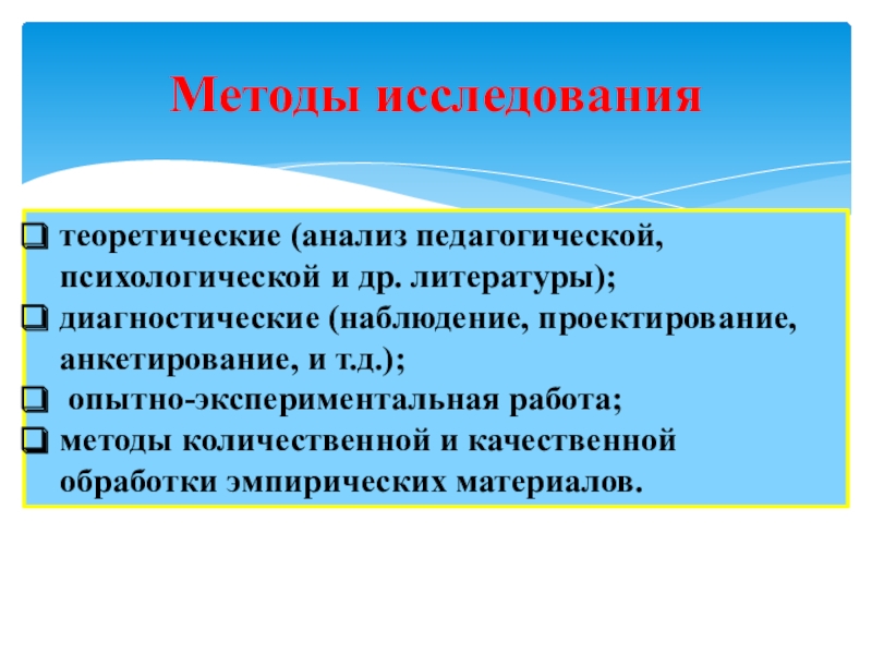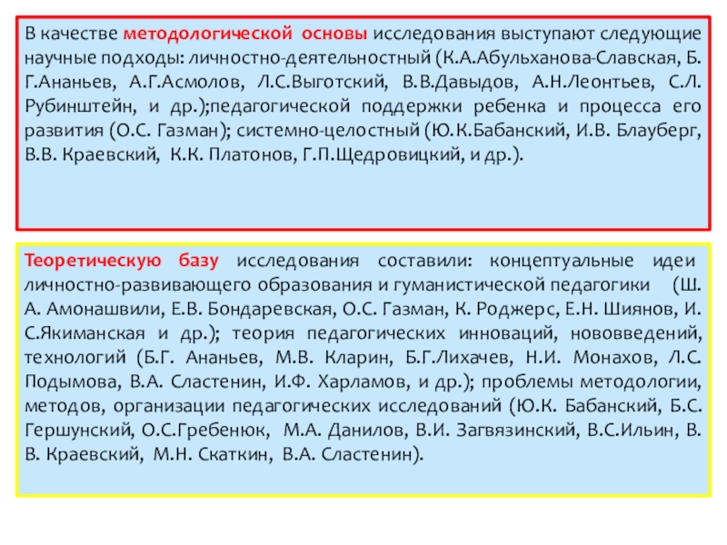 Теоретическую базу исследования составили: концептуальные идеи личностно-развивающего образования и гуманистической педагогики (Ш.А. Амонашвили, Е.В. Бондаревская, О.С. Газман, К. Роджерс, Е.Н. Шиянов, И.С.Якиманская и др.); теория педагогических инноваций, нововведений, технологий (Б.Г. Ананьев, М.В. Кларин, Б.Г.Лихачев, Н.И. Монахов, Л.С. Подымова, В.А. Сластенин, И.Ф. Харламов, и др.); проблемы методологии, методов, организации педагогических исследований (Ю.К. Бабанский, Б.С. Гершунский, О.С.Гребенюк, М.А. Данилов, В.И. Загвязинский, В.С.Ильин, В.В. Краевский, М.Н. Скаткин, В.А. Сластенин).