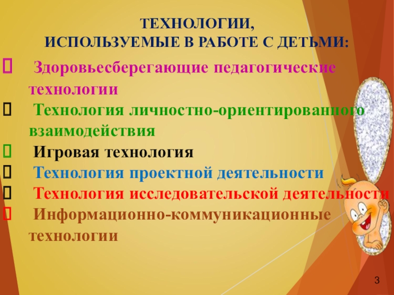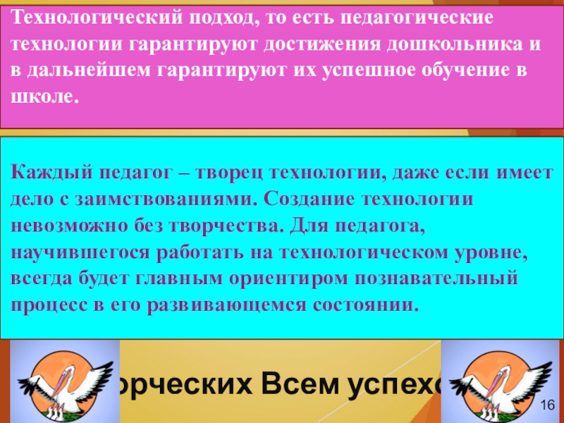 Каждый педагог – творец технологии, даже если имеет дело с заимствованиями. Создание технологии невозможно без творчества. Для педагога, научившегося работать на технологическом уровне, всегда будет главным ориентиром познавательный процесс в его развивающемся состоянии.