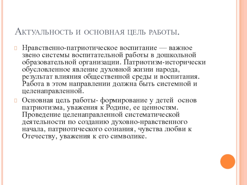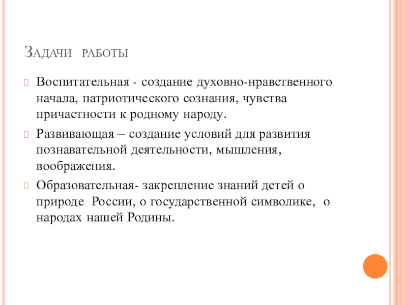 Основная цель работы- формирование у детей основ патриотизма, уважения к Родине, ее ценностям. Проведение целенаправленной систематической деятельности по созданию духовно-нравственного начала, патриотического сознания, чувства любви к Отечеству, уважения к его символике.