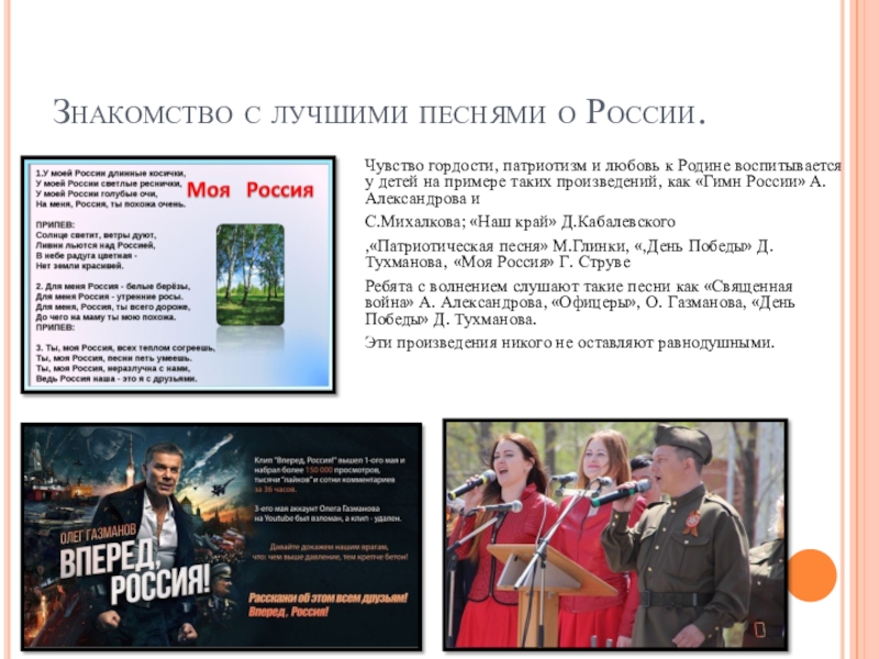 Слайд 9Знакомство с лучшими песнями о России.