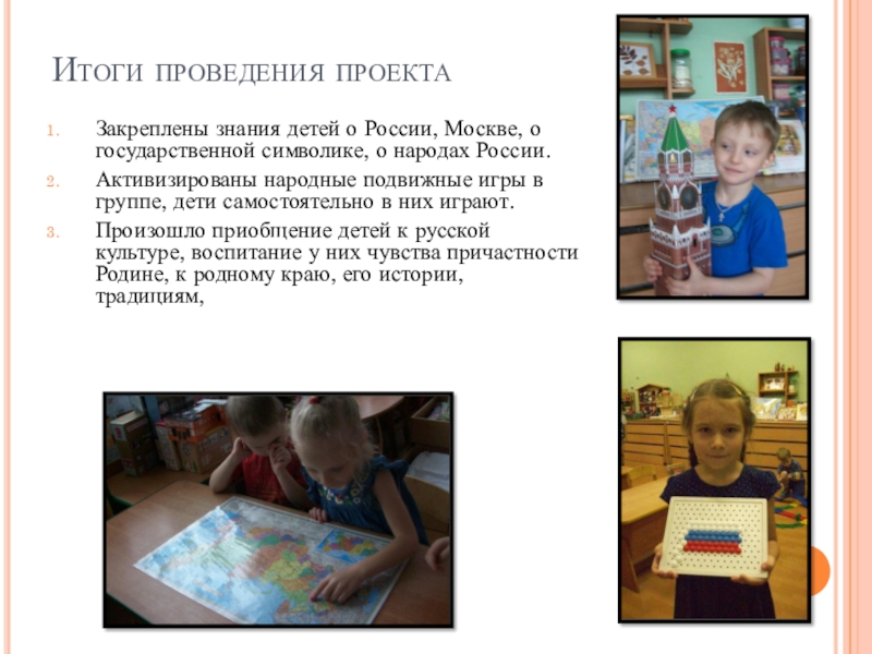 Произошло приобщение детей к русской культуре, воспитание у них чувства причастности Родине, к родному краю, его истории, традициям,