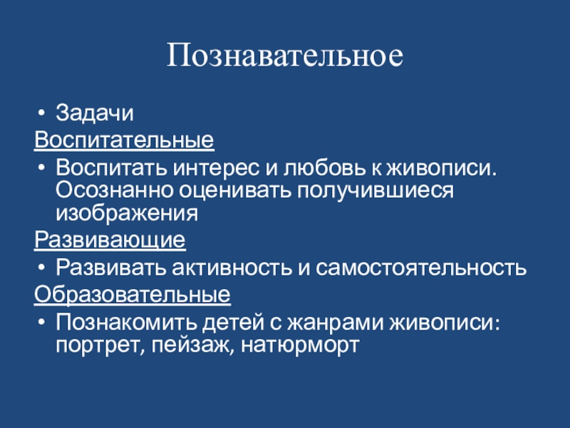 Познакомить детей с жанрами живописи: портрет, пейзаж, натюрморт