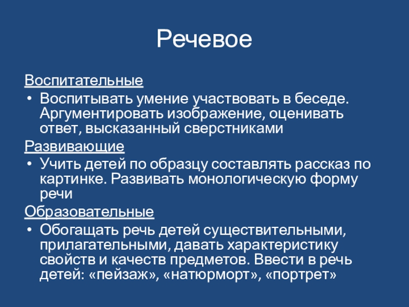 Обогащать речь детей существительными, прилагательными, давать характеристику свойств и качеств предметов. Ввести в речь детей: «пейзаж», «натюрморт», «портрет»