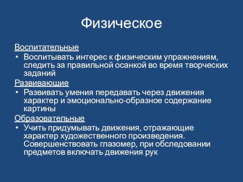 Учить придумывать движения, отражающие характер художественного произведения. Совершенствовать глазомер, при обследовании предметов включать движения рук