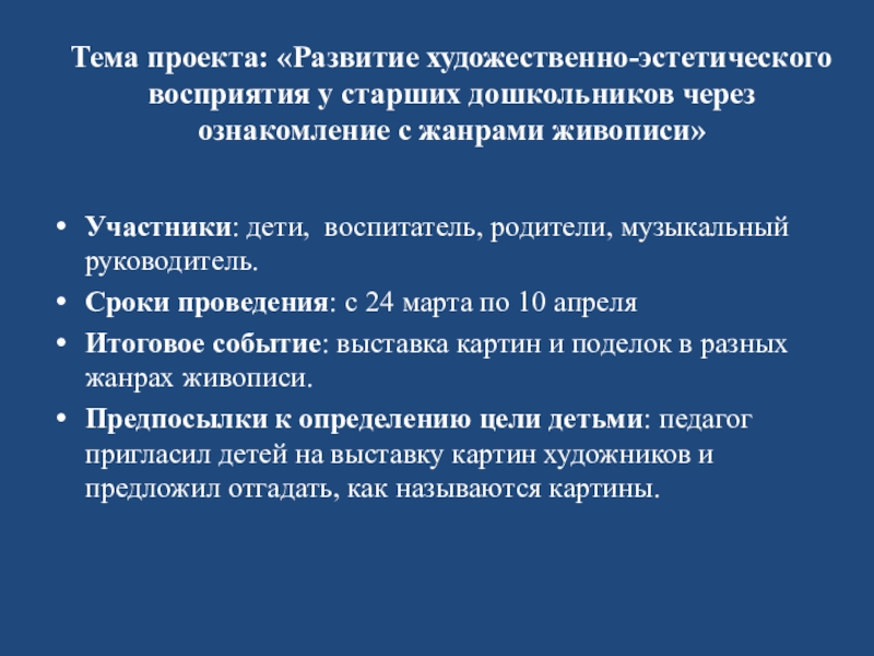 Слайд 3Тема проекта: «Развитие художественно-эстетического восприятия у старших дошкольников через ознакомление с
