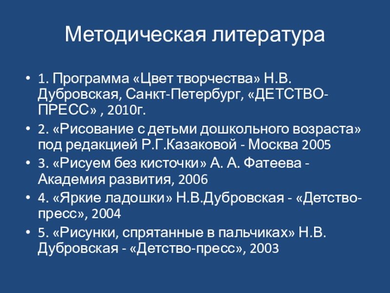 1. Программа «Цвет творчества» Н.В. Дубровская, Санкт-Петербург, «ДЕТСТВО-ПРЕСС» , 2010г.