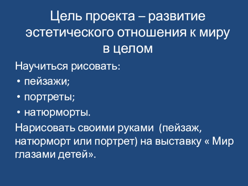Слайд 4Цель проекта – развитие эстетического отношения к миру в целом