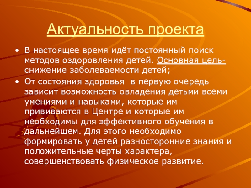 От состояния здоровья в первую очередь зависит возможность овладения детьми всеми умениями и навыками, которые им прививаются в Центре и которые им необходимы для эффективного обучения в дальнейшем. Для этого необходимо формировать у детей разносторонние знания и положительные черты характера, совершенствовать физическое развитие.