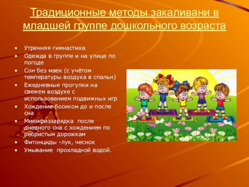 Слайд 15Традиционные методы закаливани в младшей группе дошкольного возраста