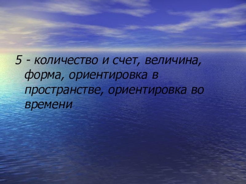 5 - количество и счет, величина, форма, ориентировка в пространстве, ориентировка во времени