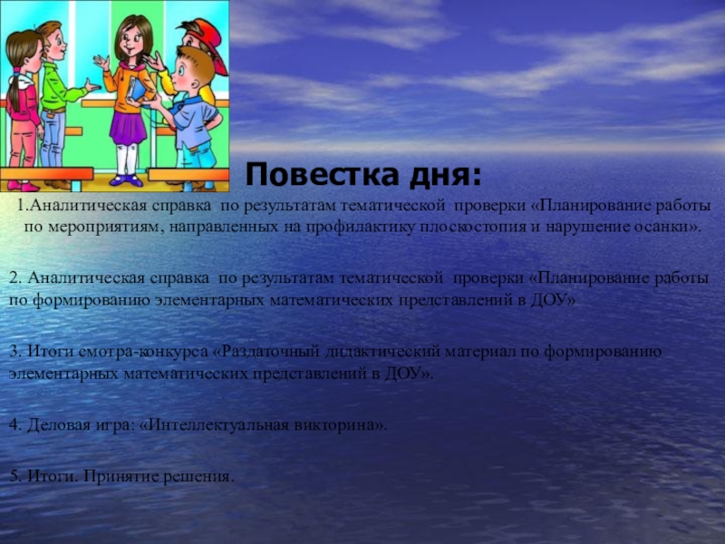 Повестка дня: 1.Аналитическая справка  по результатам тематической  проверки «Планирование работы по мероприятиям, направленных на профилактику плоскостопия и нарушение осанки».2. Аналитическая справка  по результатам тематической  проверки «Планирование работы по формированию элементарных математических представлений в ДОУ»3. Итоги смотра-конкурса «Раздаточный дидактический материал по формированию элементарных