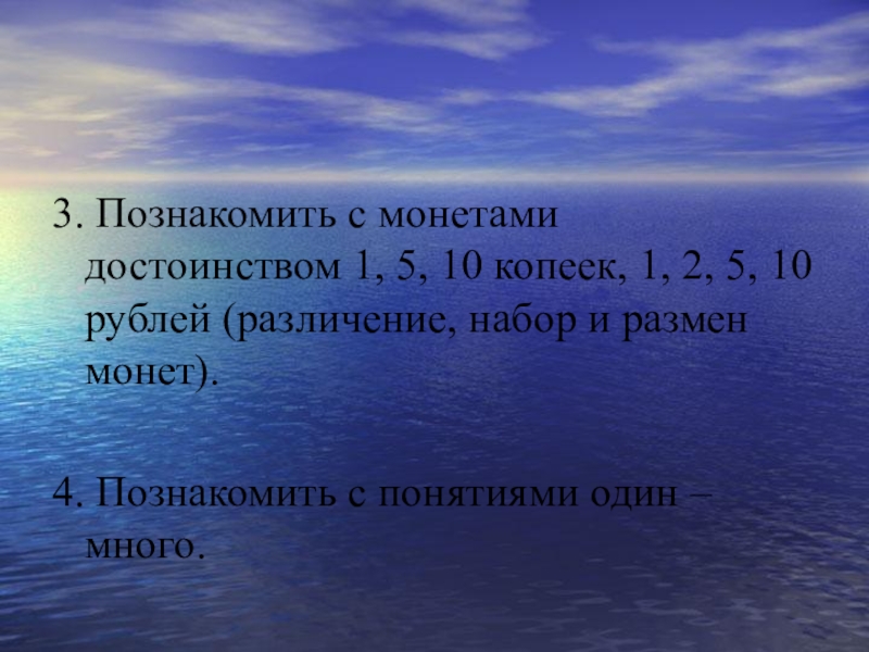 3. Познакомить с монетами достоинством 1, 5, 10 копеек, 1, 2, 5, 10 рублей (различение, набор и