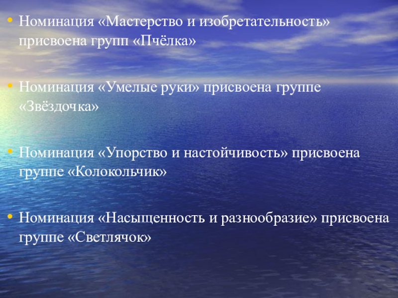 Номинация «Мастерство и изобретательность» присвоена групп «Пчёлка»Номинация «Умелые руки» присвоена группе «Звёздочка»Номинация «Упорство и настойчивость» присвоена группе