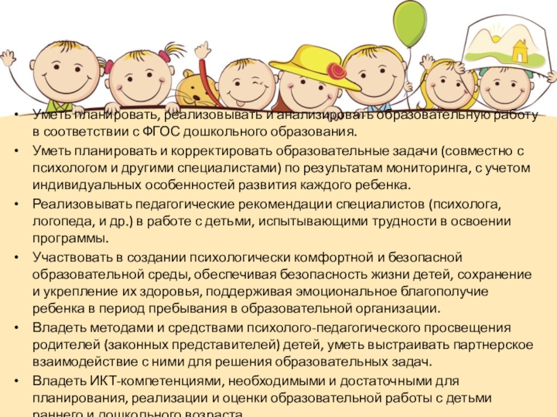 Уметь планировать и корректировать образовательные задачи (совместно с психологом и другими специалистами) по результатам мониторинга, с учетом индивидуальных особенностей развития каждого ребенка.
