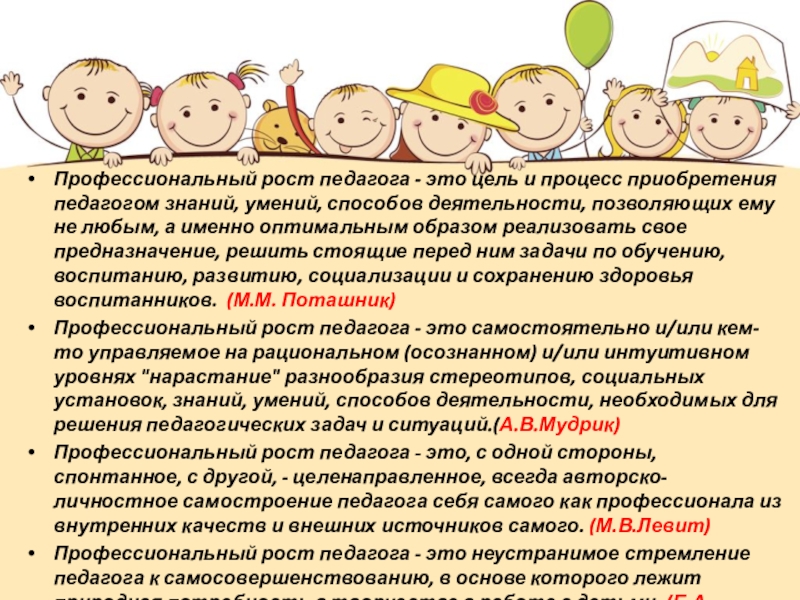 Профессиональный рост педагога - это неустранимое стремление педагога к самосовершенствованию, в основе которого лежит природная потребность в творчестве в работе с детьми. (Е.А.Ямбург)