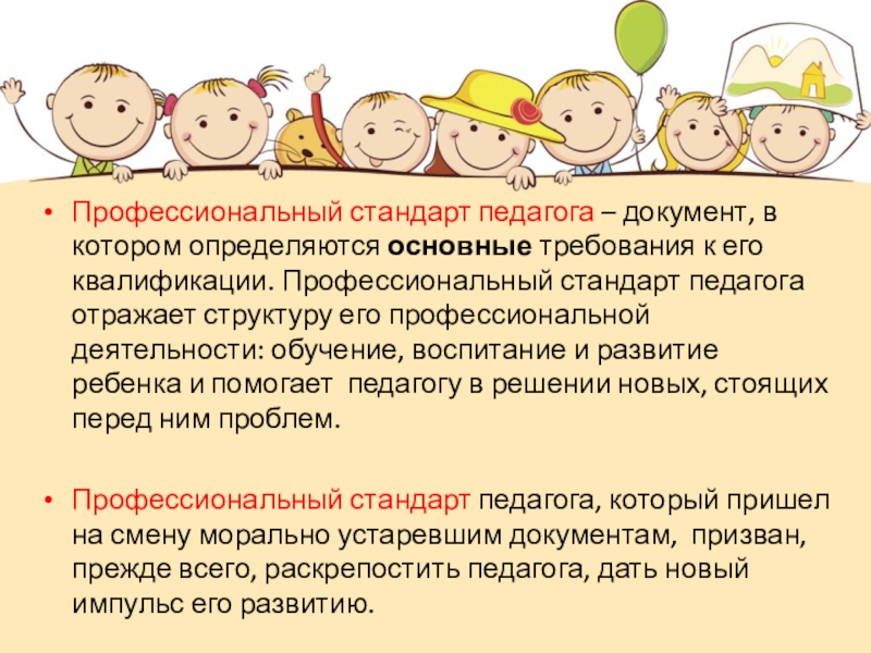 Слайд 2Профессиональный стандарт педагога – документ, в котором определяются основные требования к его квалификации.