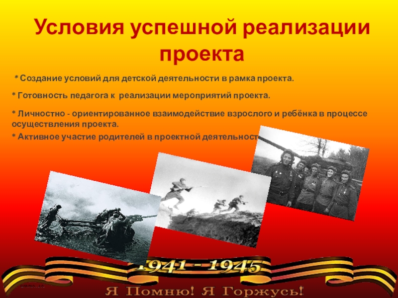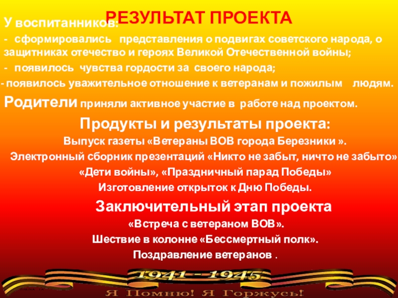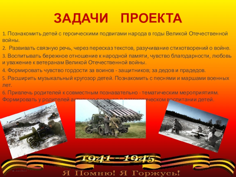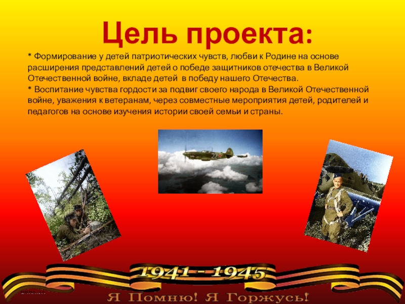 * Воспитание чувства гордости за подвиг своего народа в Великой Отечественной войне, уважения к ветеранам, через совместные мероприятия детей, родителей и педагогов на основе изучения истории своей семьи и страны.
