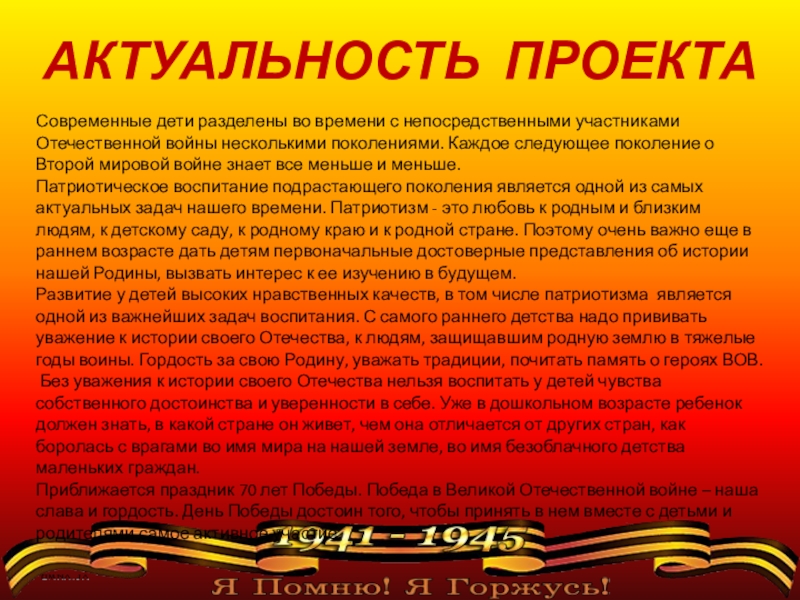 Развитие у детей высоких нравственных качеств, в том числе патриотизма является одной из важнейших задач воспитания. С самого раннего детства надо прививать уважение к истории своего Отечества, к людям, защищавшим родную землю в тяжелые годы воины. Гордость за свою Родину, уважать традиции, почитать память о героях ВОВ.